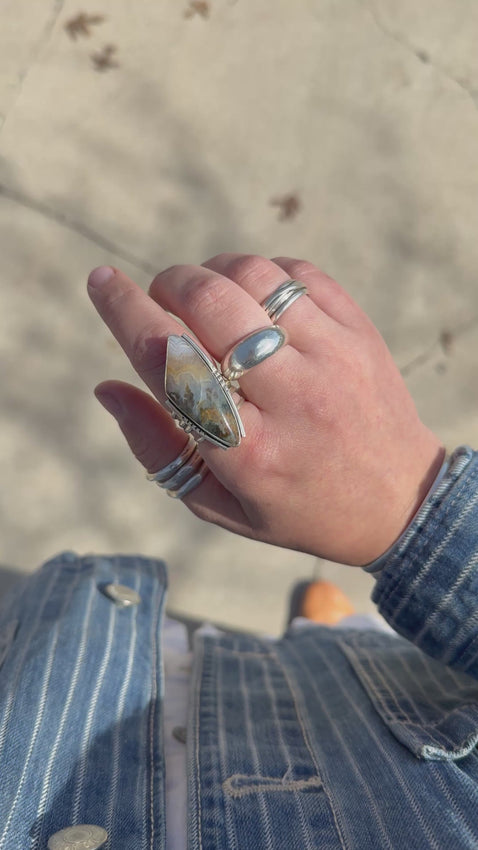 US sz. 8.25 .925 sterling silver Priday Plume Agate multi-gauged split shank ring. This ring features fine silver round wire, hand stamped on either side of the gorgeous stone. Priday Plume Agate is found at the eastern edge of the Deschutes Basin, northeast of the town of Madras, Oregon.